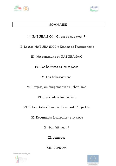 Exemple du sommaire (site des Etangs de l'Armagnac)